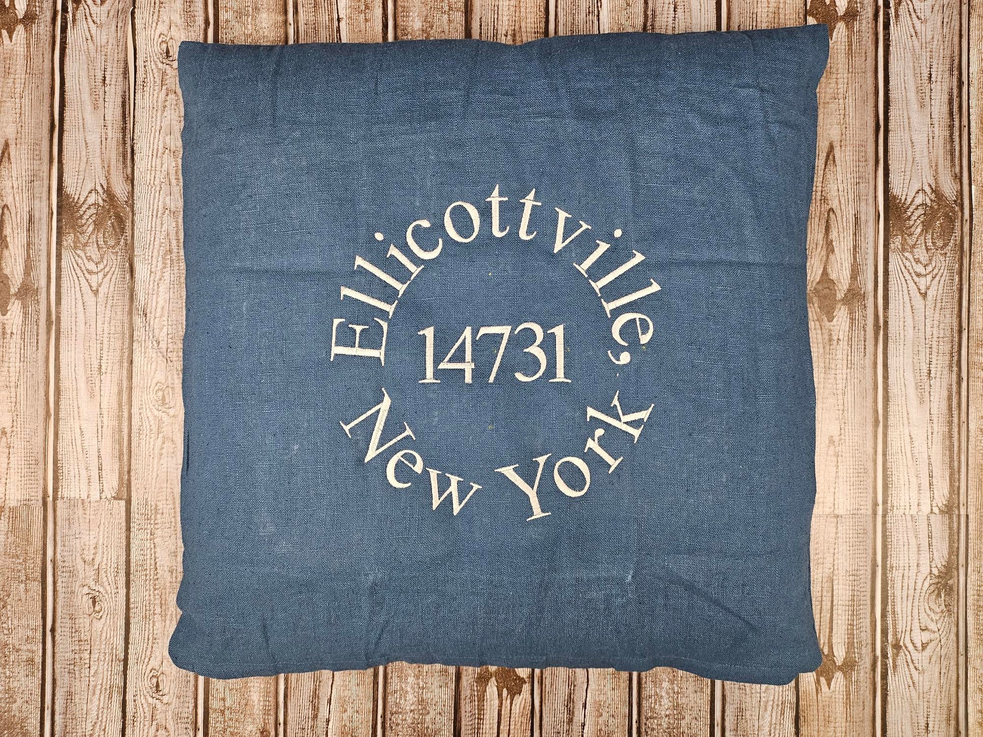 Measuring 12x12 inches, each cover features the word “Ellicottville, New York” with customized zip code in the center in a silver thread on an antique denim blue pillow cover.