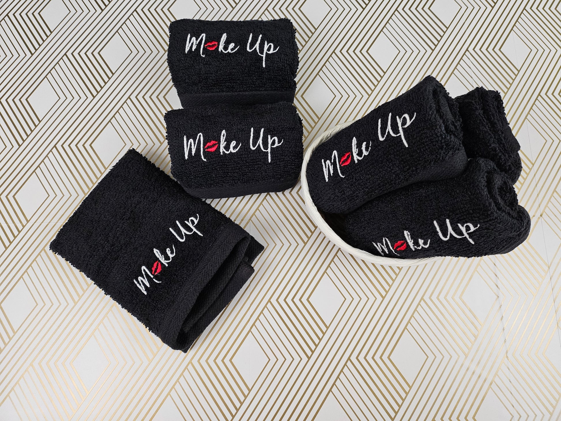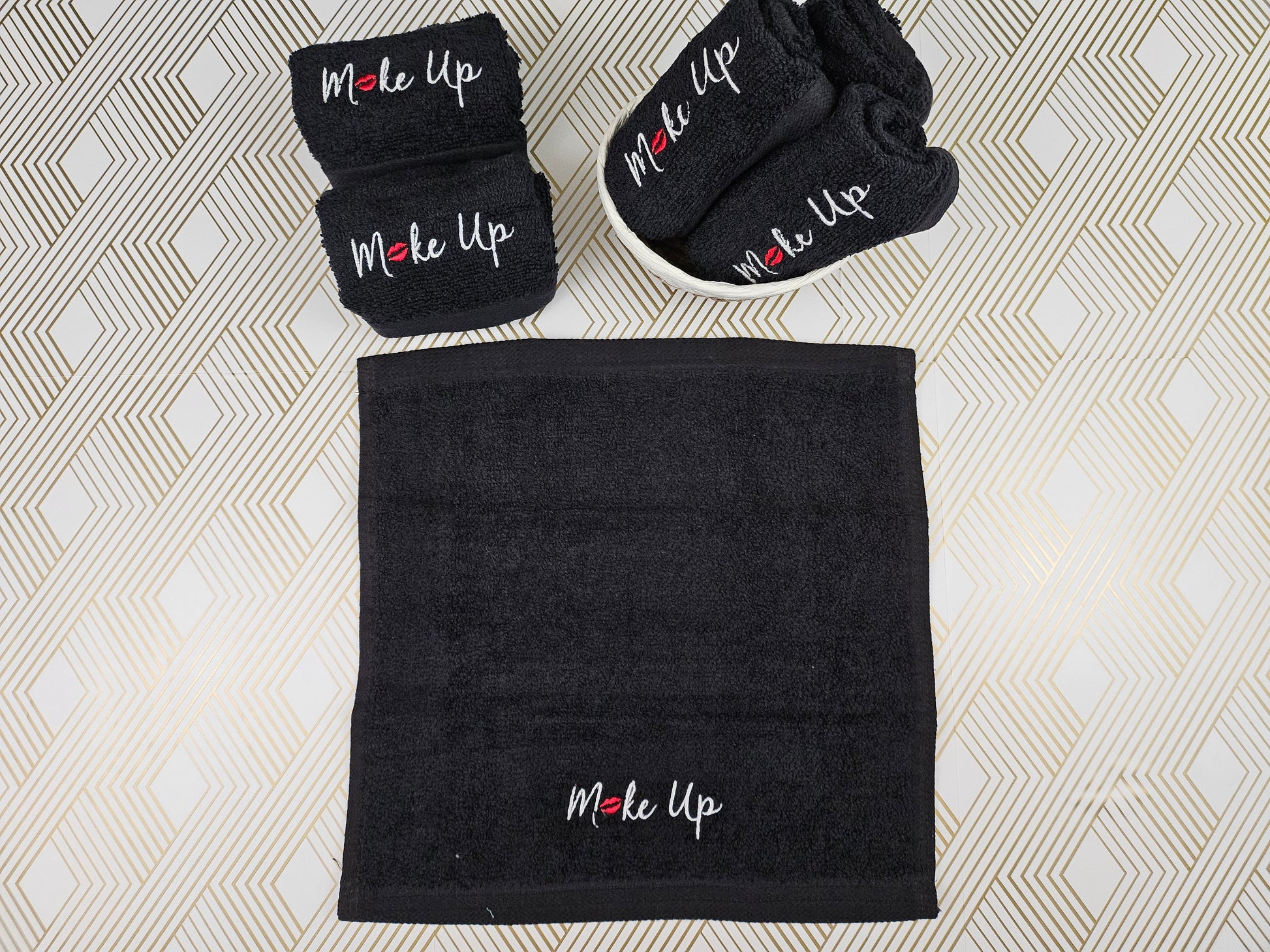 Reusable Makeup Towels – Black Terrycloth with Red Lipstick Embroidery